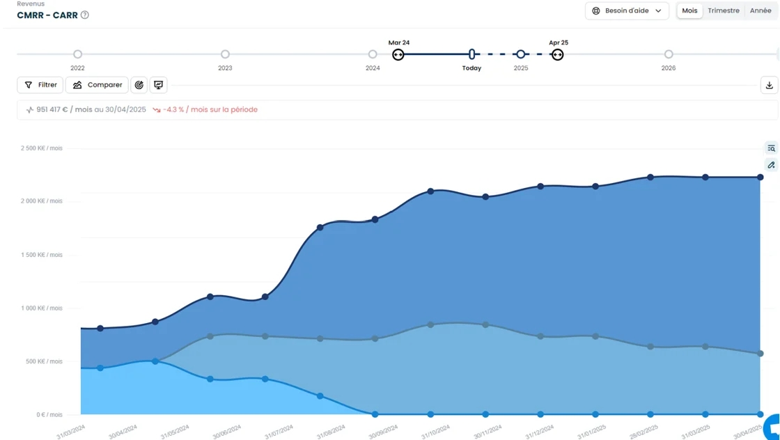 Le calcul du CMRR - CARR évolue pour vous permettre d'avoir une vision encore plus fine de vos revenus "signés" mais non encore facturés. Le calcul prend désormais en compte les abonnements futurs issus du/des systèmes de facturation que vous utilisez ! Ces abonnements peuvent être renseignés depuis votre logiciel de facturation, mais également via le template excel qui a été mis à jour ou bien directement depuis la plateforme.