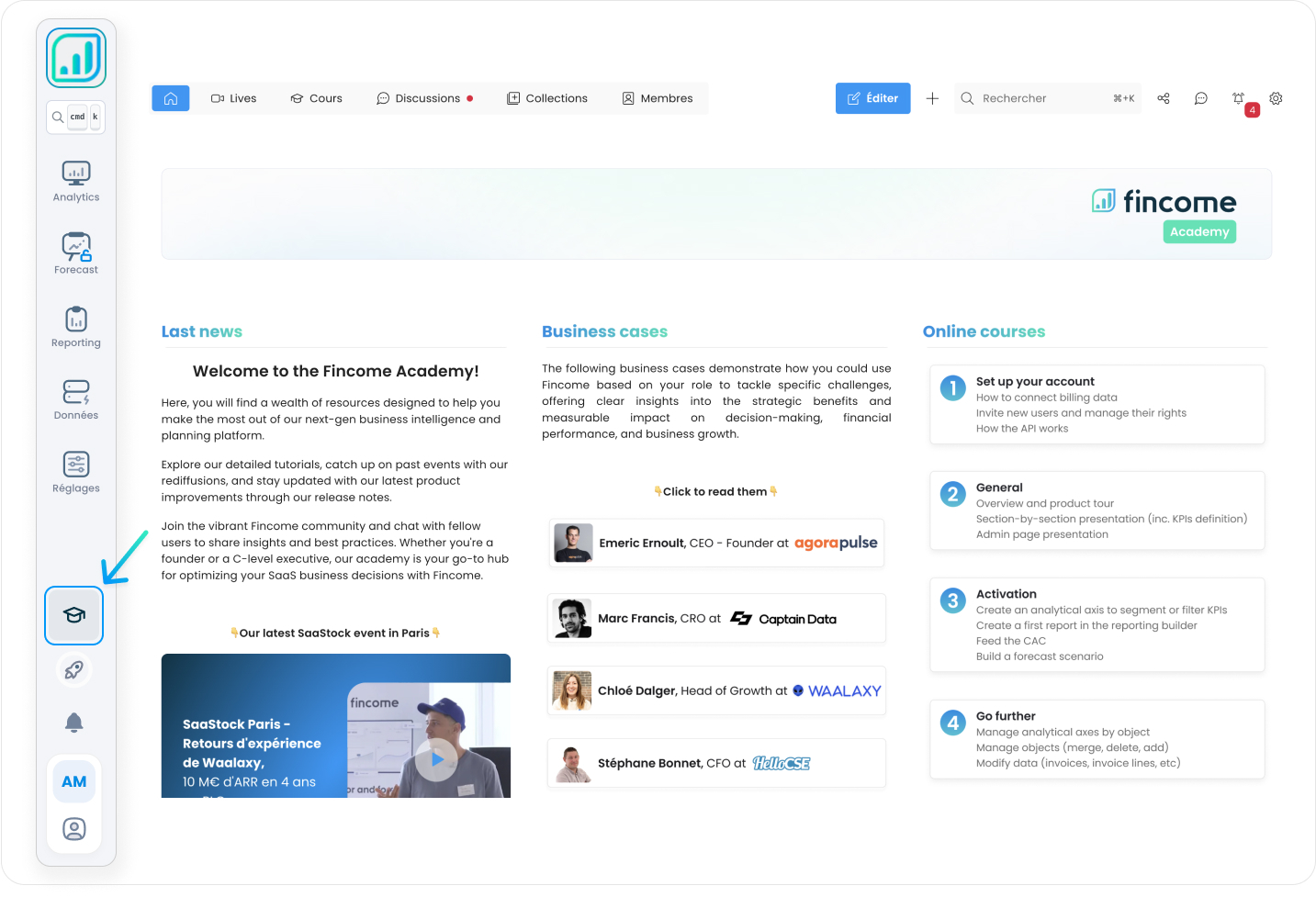 Nous avons créé une académie Fincome pour vous faciliter l'usage et vous permettre d'aller plus loin dans votre utilisation des fonctionnalités les plus avancées. Cette académie vient compléter le Help Center de Fincome avec des vidéos tutorielles, des business cases et de nombreuses autres ressources pour vous permettre de tirer le plein potentiel de Fincome. L'académie va continuer de s'enrichir dans les prochaines semaines pour devenir le centre névralgique de support et un espace d'échanges privilégiés entre utilisateurs de Fincome.