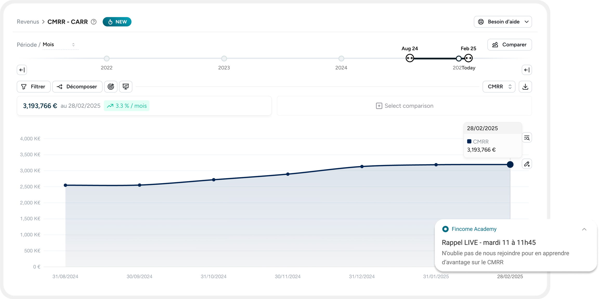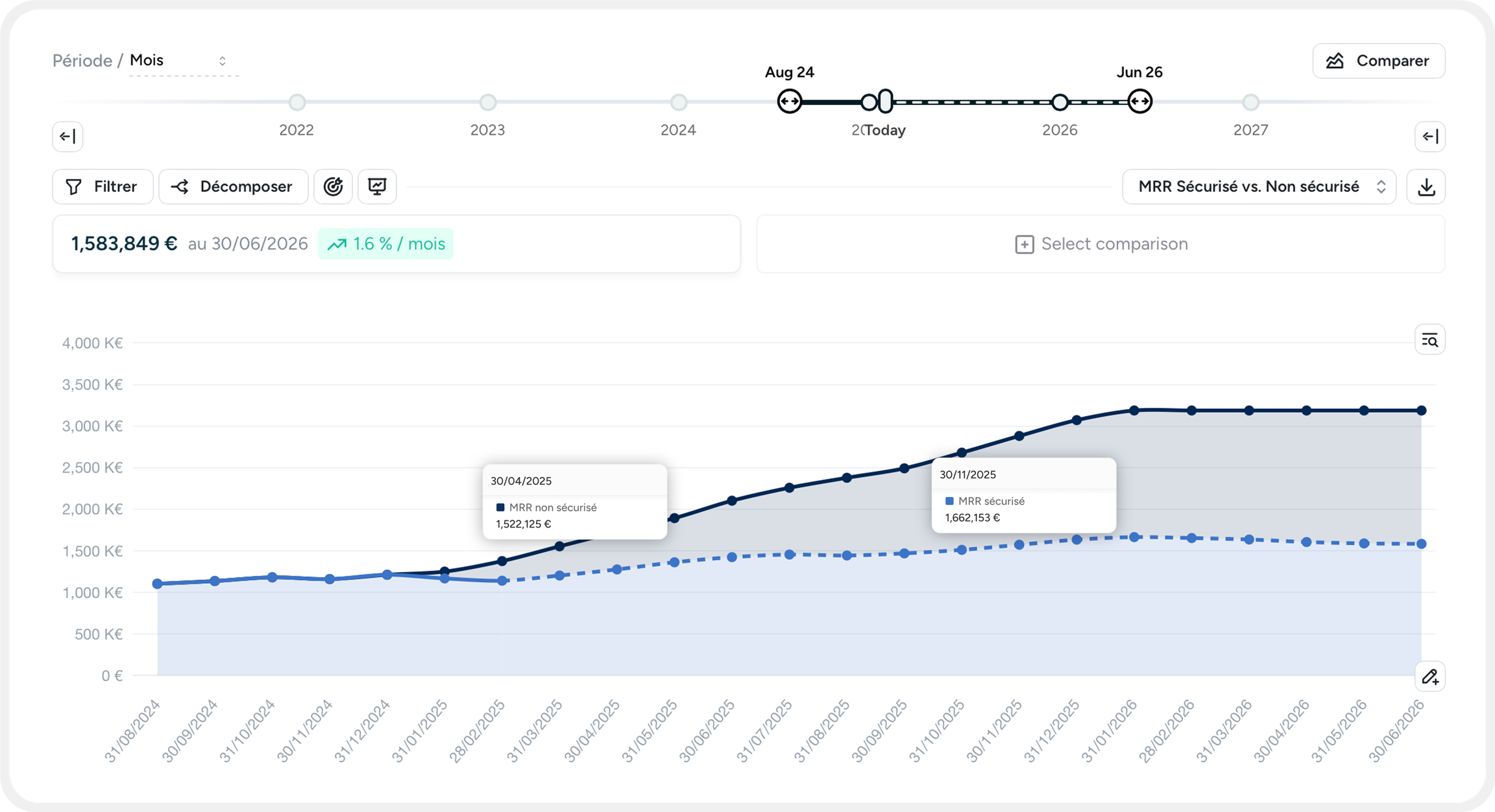 • Sur la base de ces analyses, identifiez les mouvements de MRR – ARR prospectifs, ajustez votre stratégie commerciale et renforcez la solidité de vos forecast ainsi que la confiance de vos investisseurs avec une vision fiable de vos revenus futurs