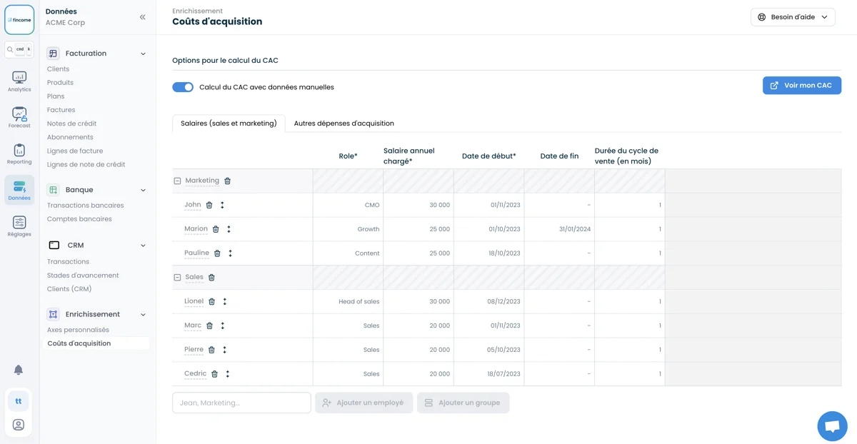 You can now calculate your CAC very precisely by entering your acquisition costs on your Fincome dashboard. Go to “Data” > “Acquisition costs” and enter the salaries of your sales and marketing teams and other related expenses.