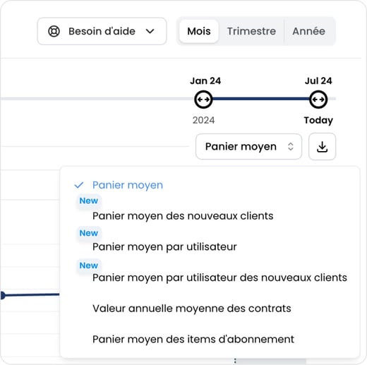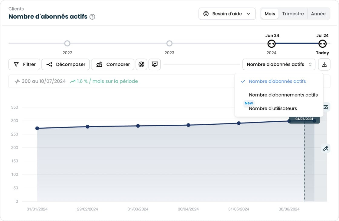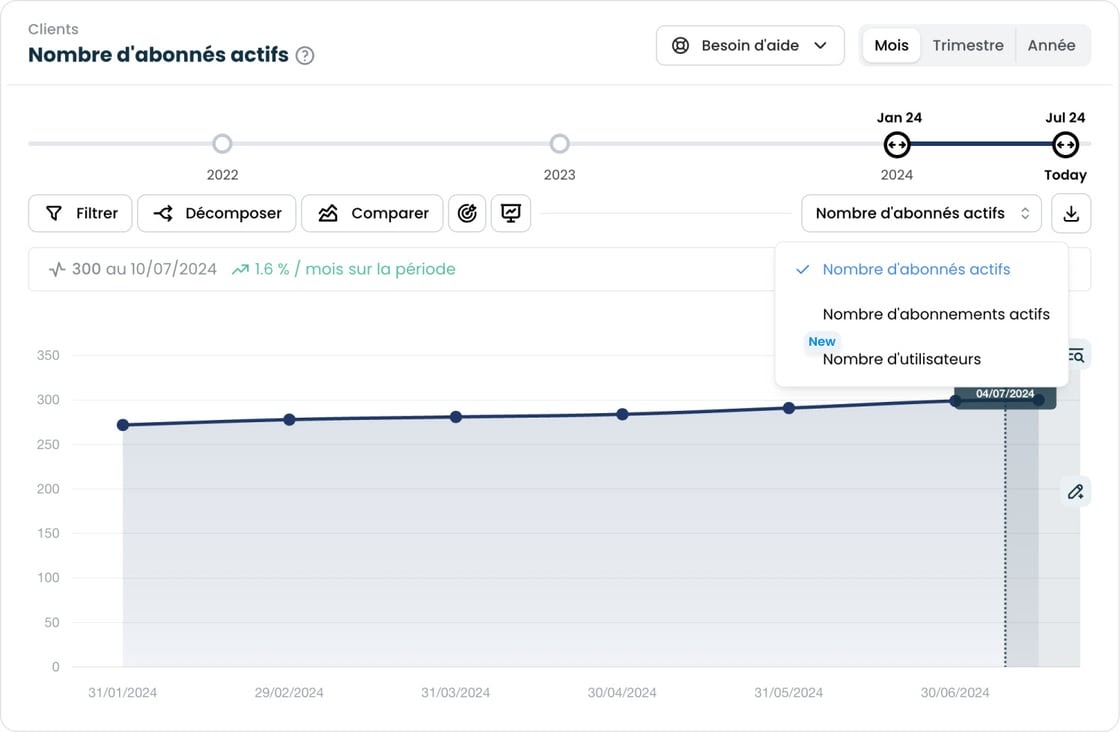 Number of active subscribers: you can now display the “Number of users” in this section. This metric is based on the “Quantity” fields of invoice lines.